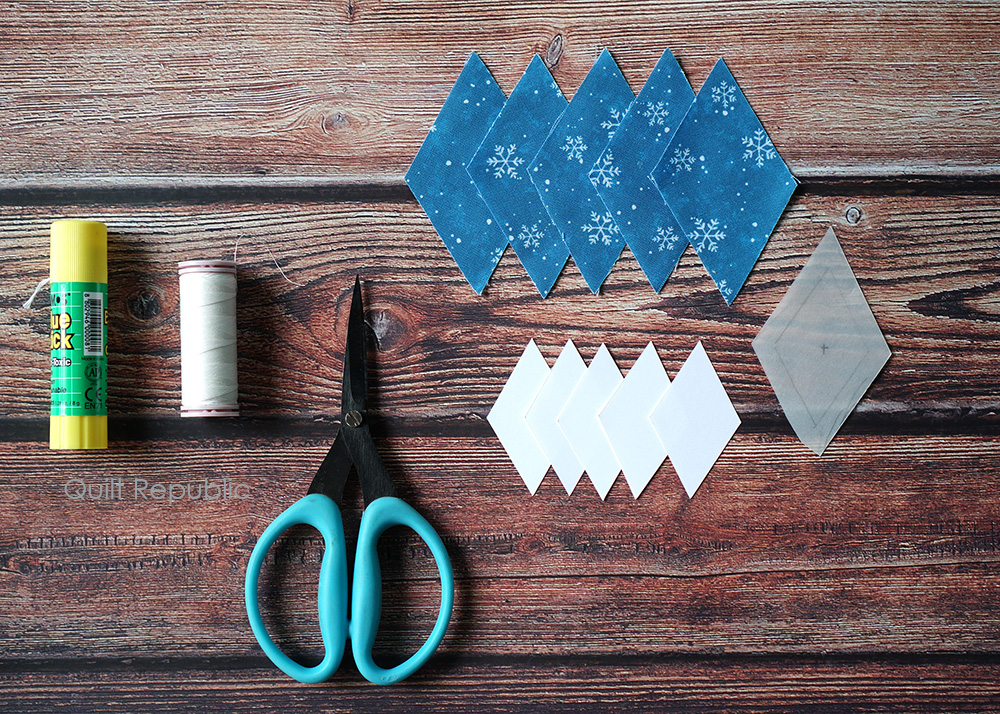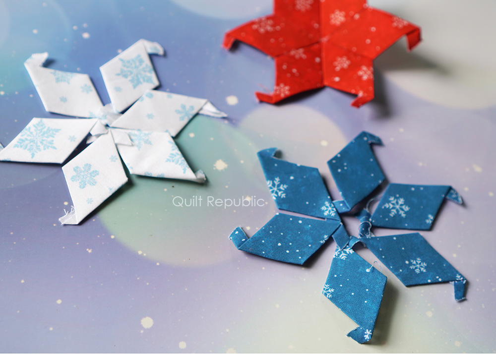 อยากได้สีไหนเลือกทำได้เลยค่ะ   งานชิ้นนี้เราจะทำเป็นดอก 2 ดอก แต่ละดอกประกอบด้วยสี่เหลี่ยม 6  ชิ้น  รวมทั้งหมด 12 ชิ้น  เอ๋เลือกใช้ผ้าลาย Northcott Christmas Woodland Snowflakes White  หรือใช้ลาย Christmas Wonder Red หรือ Christmas Wonder Blue ก็ได้