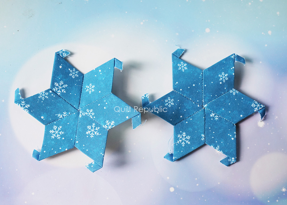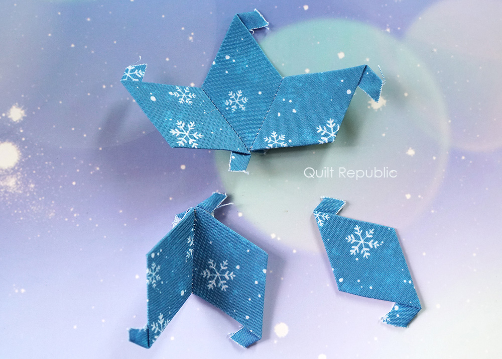 ในแต่ละให้เอามาสอยพันริมติดกันก่อน 2 ชิ้น จำนวน 2 ชุดก่อนที่จะสอยชิ้นที่สามติดกัน  จะได้สี่หเหลี่ยม 3 ชิ้นติดกัน 2 ชุดตามรูป