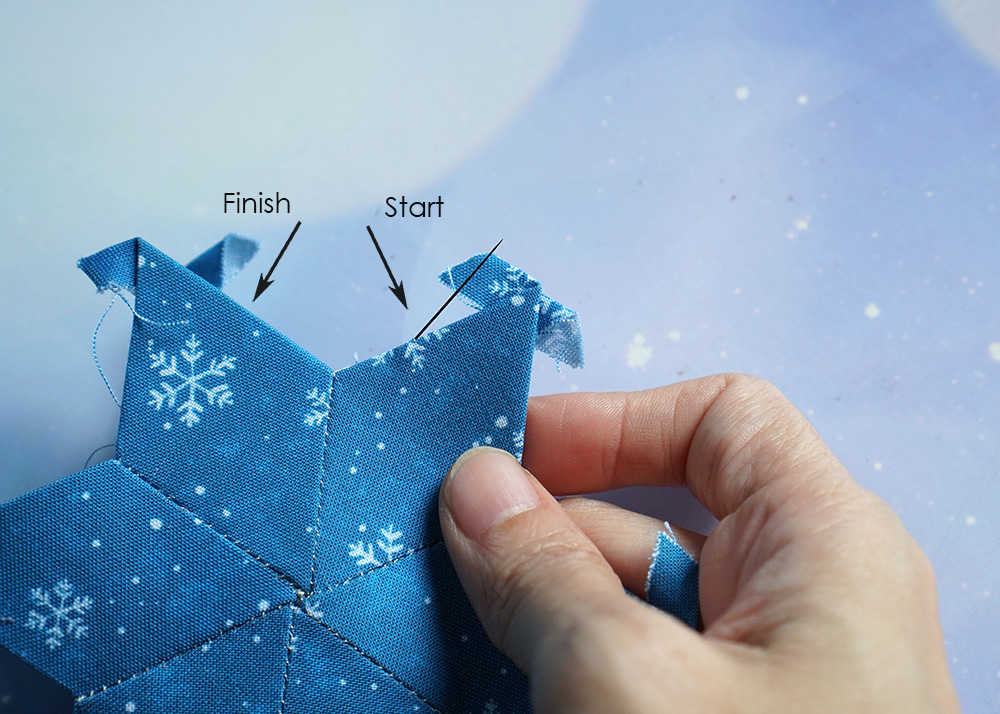 สอยดาวทั้ง 2 ชิ้นติดกัน  ให้เริ่มจากบริเวณจุด Start แล้วสอยไปจนรอบก่อนที่จะหยุดบริเวณจุด finish เพื่อเว้นช่องไว้สำหรับยัดใย