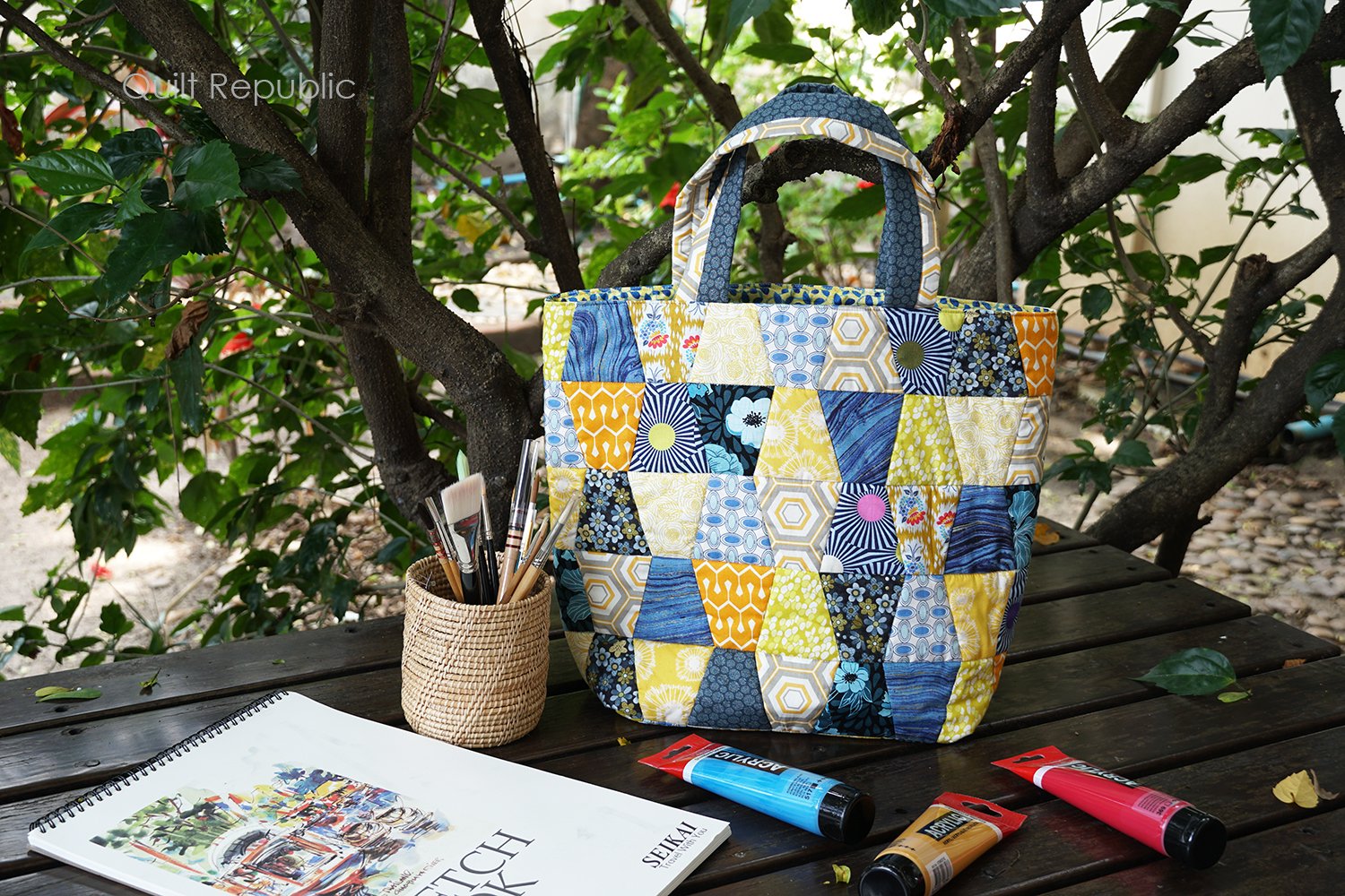 กระเป๋าสะพายขนาดกำลังพอดี จุของได้เยอะ ผู้รียนจะได้หัดการต่อผ้าด้วยเทคนิคการใช่เทมเพลต การควิลท์ด้วย walking foot